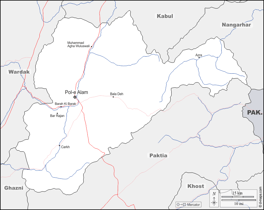 d-maps > एशिया > अफ़गानिस्तान > लोगर प्रान्त > सीमाओं, जल-सर्वेक्षण, मुख्य शहरों, सड़कों, नाम