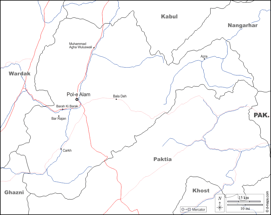 d-maps > एशिया > अफ़गानिस्तान > लोगर प्रान्त > सीमाओं, जल-सर्वेक्षण, मुख्य शहरों, सड़कों, नाम, सफेद