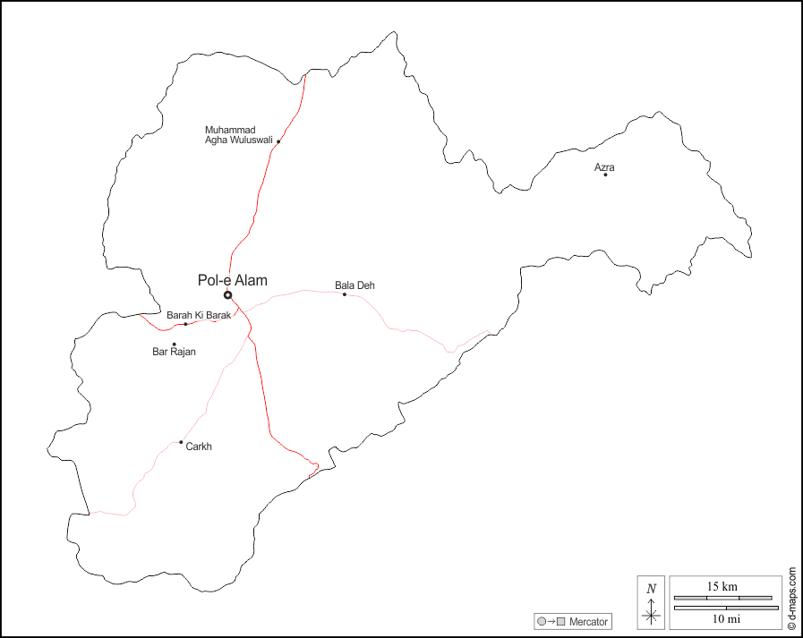 d-maps > एशिया > अफ़गानिस्तान > लोगर प्रान्त > बाह्यरेखा, मुख्य शहरों, सड़कों, नाम, सफेद