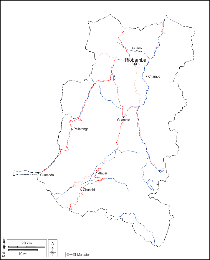 d-maps > महाअमेरिका > इक्वेडोर > चिम्बोराज़ो प्रांत > बाह्यरेखा, जल-सर्वेक्षण, मुख्य शहरों, सड़कों, नाम, सफेद