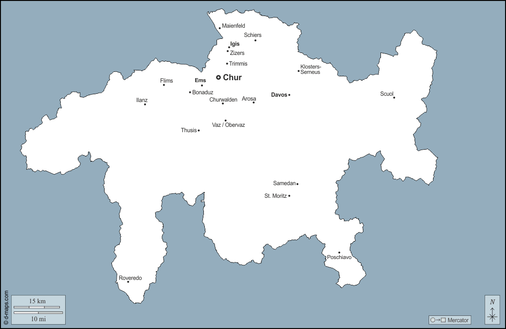 d-maps > यूरोप > स्विट्ज़रलैंड > ग्राउबुन्डन कैन्टन > बाह्यरेखा, मुख्य शहरों, नाम