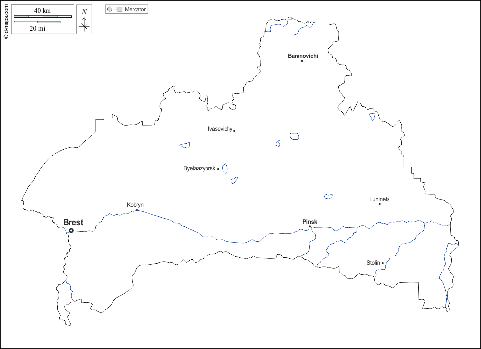 d-maps > यूरोप > बेलारूस > ब्रेस्ट > बाह्यरेखा, जल-सर्वेक्षण, मुख्य शहरों, नाम, सफेद