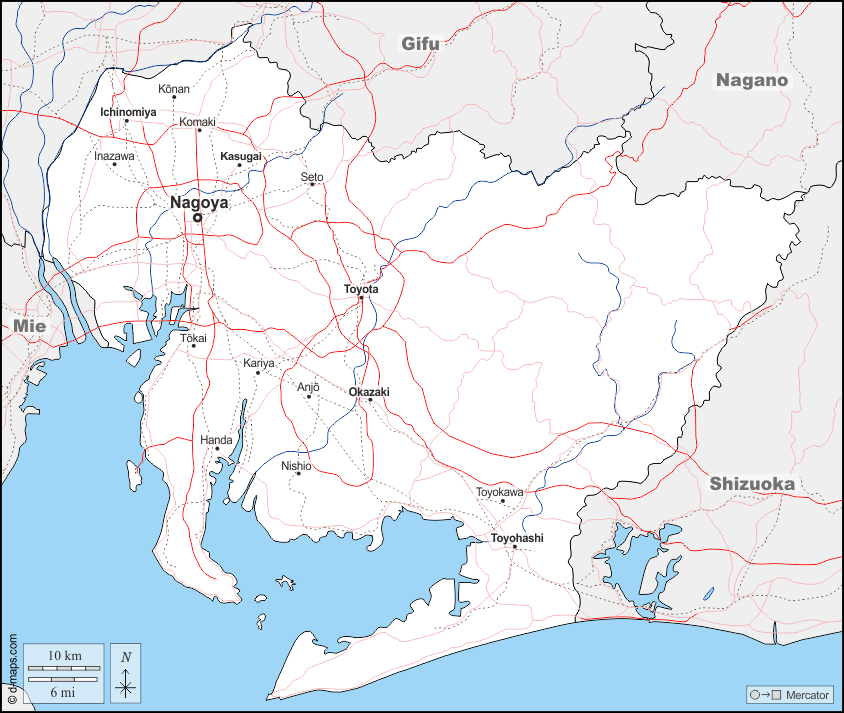 d-maps > एशिया > जापान > आइचीआइची प्रीफ़ेक्चर > सीमाओं, जल-सर्वेक्षण, मुख्य शहरों, सड़कों, नाम