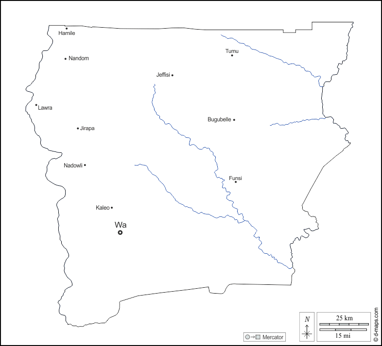 d-maps > अफ्रीका > घाना > अपर वेस्ट > बाह्यरेखा, जल-सर्वेक्षण, मुख्य शहरों, नाम, सफेद
