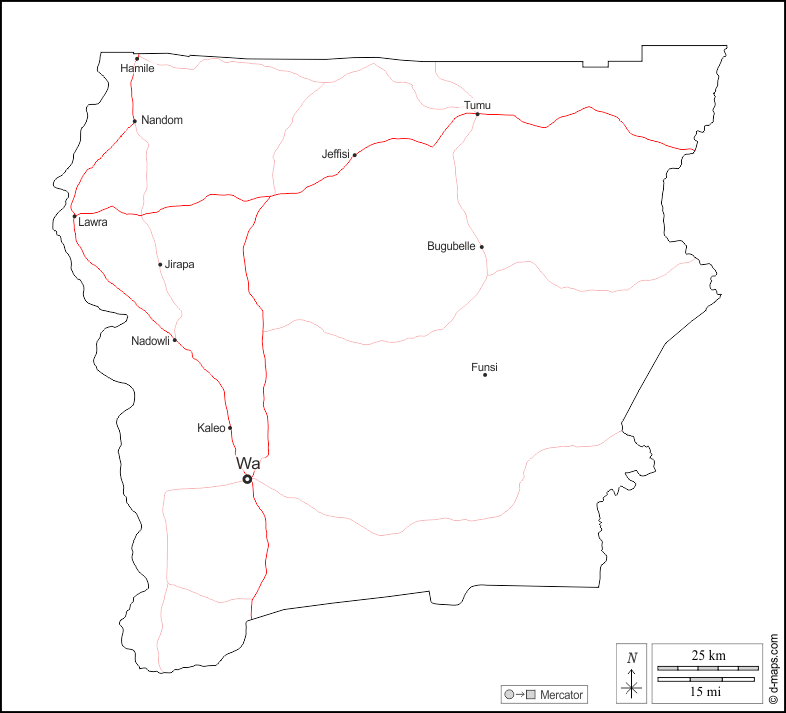 d-maps > अफ्रीका > घाना > अपर वेस्ट > बाह्यरेखा, मुख्य शहरों, सड़कों, नाम, सफेद