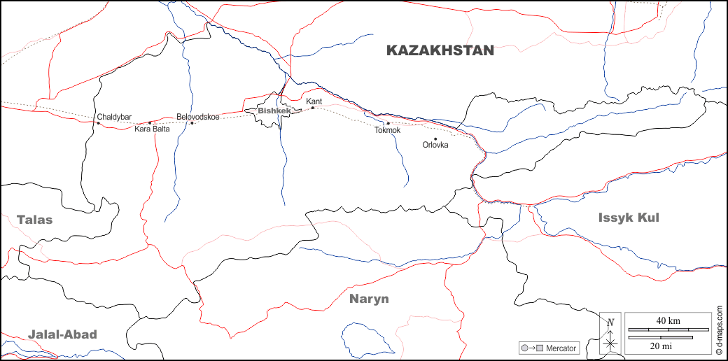 d-maps > एशिया > किरगिज़स्तान > चुय प्रांत > सीमाओं, जल-सर्वेक्षण, मुख्य शहरों, सड़कों, नाम, सफेद