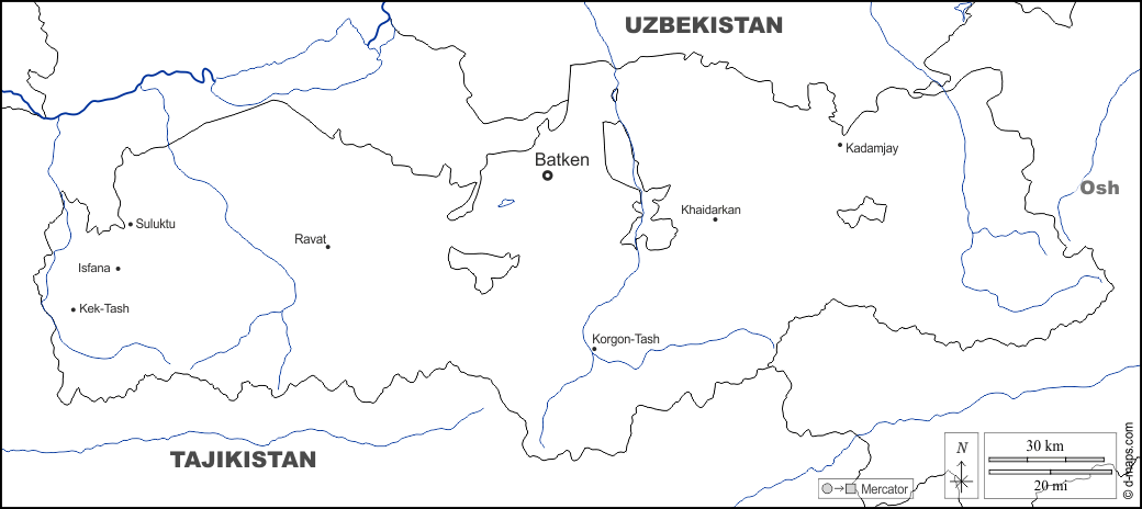 d-maps > एशिया > किरगिज़स्तान > बातकेन प्रांत > सीमाओं, जल-सर्वेक्षण, मुख्य शहरों, नाम, सफेद