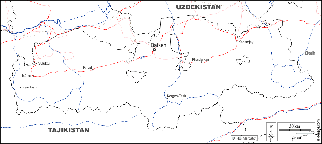 d-maps > एशिया > किरगिज़स्तान > बातकेन प्रांत > सीमाओं, जल-सर्वेक्षण, मुख्य शहरों, सड़कों, नाम, सफेद