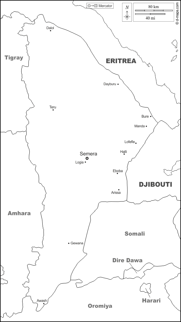 d-maps > अफ्रीका > इथियोपिया > अफ़ार प्रदेश > सीमाओं, मुख्य शहरों, नाम, सफेद