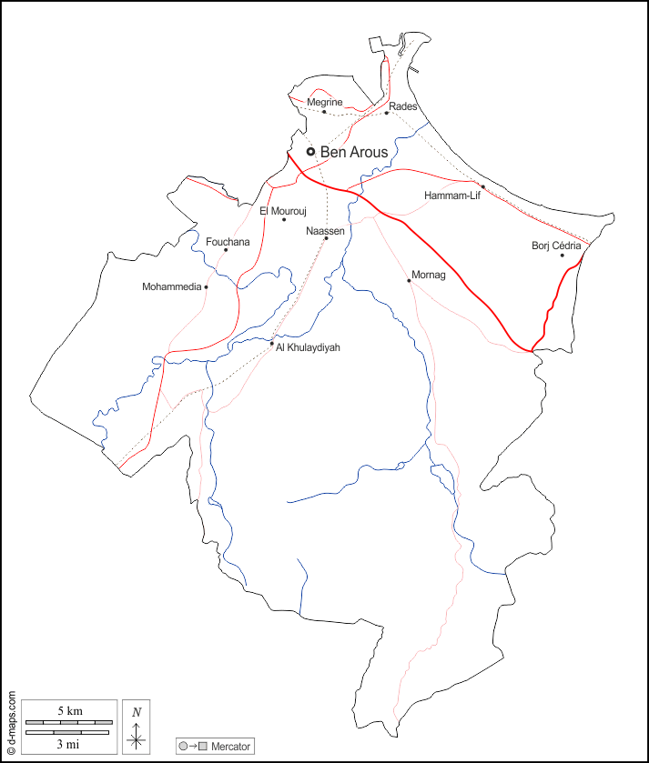 d-maps > अफ्रीका > ट्यूनीशिया > बेन अरौस > बाह्यरेखा, जल-सर्वेक्षण, मुख्य शहरों, सड़कों, नाम, सफेद