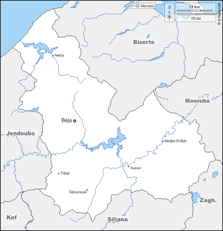 d-maps > अफ्रीका > ट्यूनीशिया > बीजा > सीमाओं, जल-सर्वेक्षण, मुख्य शहरों, नाम