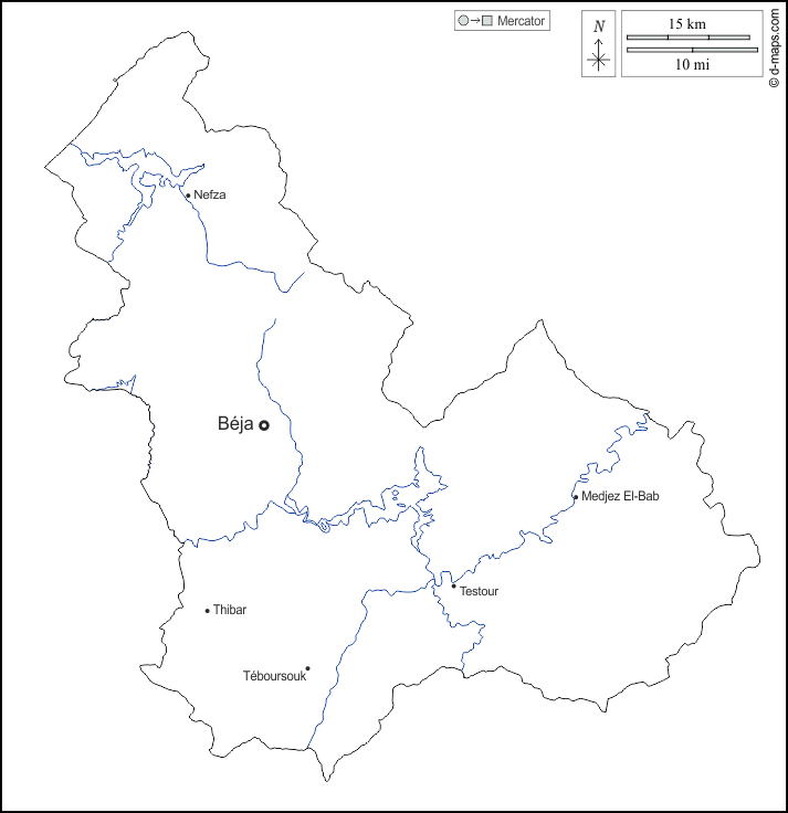 d-maps > अफ्रीका > ट्यूनीशिया > बीजा > बाह्यरेखा, जल-सर्वेक्षण, मुख्य शहरों, नाम, सफेद