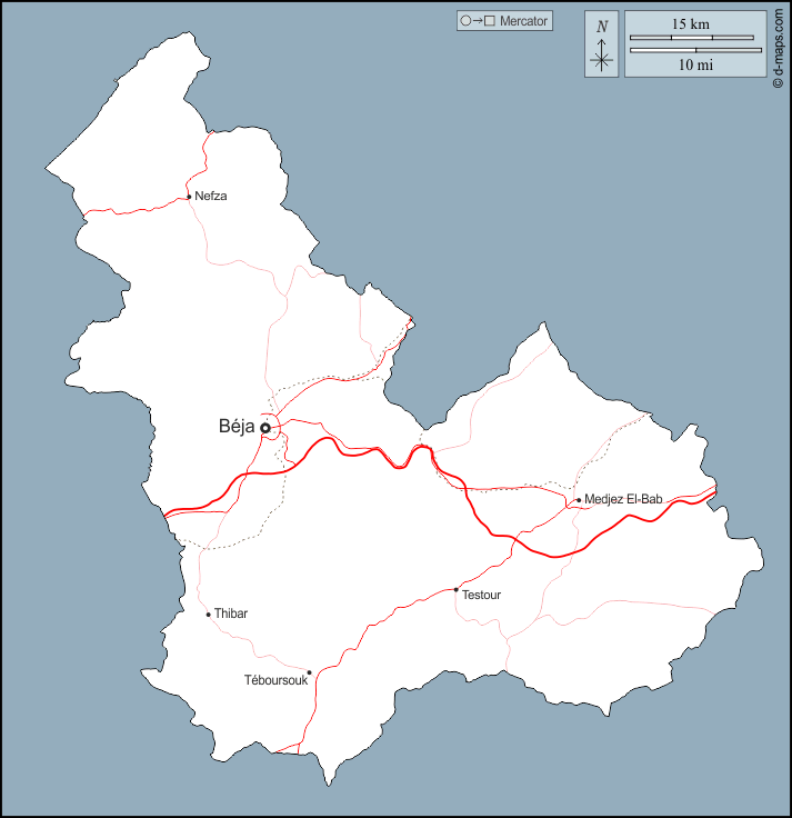 d-maps > अफ्रीका > ट्यूनीशिया > बीजा > बाह्यरेखा, मुख्य शहरों, सड़कों, नाम