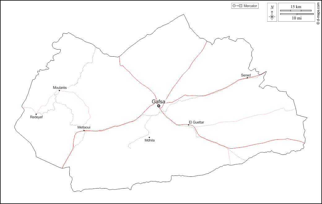 d-maps > अफ्रीका > ट्यूनीशिया > गाफ्सा > बाह्यरेखा, मुख्य शहरों, सड़कों, नाम, सफेद