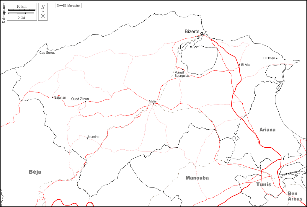 d-maps > अफ्रीका > ट्यूनीशिया > बिज़ेर्ते > सीमाओं, मुख्य शहरों, सड़कों, नाम, सफेद