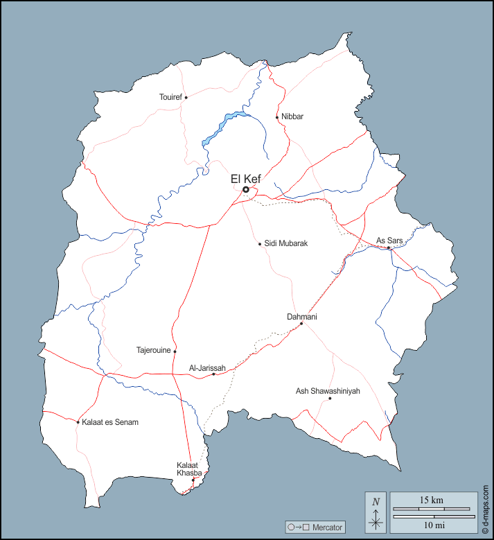 d-maps > अफ्रीका > ट्यूनीशिया > कैफ > बाह्यरेखा, जल-सर्वेक्षण, मुख्य शहरों, सड़कों, नाम