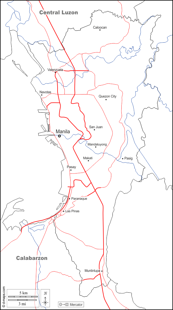 d-maps > एशिया > फिलीपींस > मेट्रो मनीला > सीमाओं, जल-सर्वेक्षण, मुख्य शहरों, सड़कों, नाम, सफेद