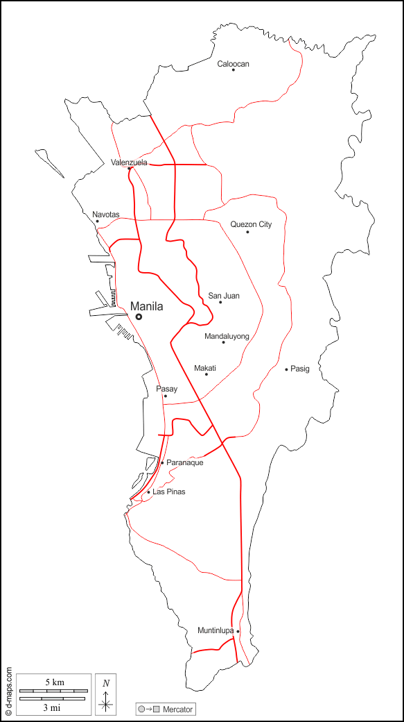 d-maps > एशिया > फिलीपींस > मेट्रो मनीला > बाह्यरेखा, मुख्य शहरों, सड़कों, नाम, सफेद