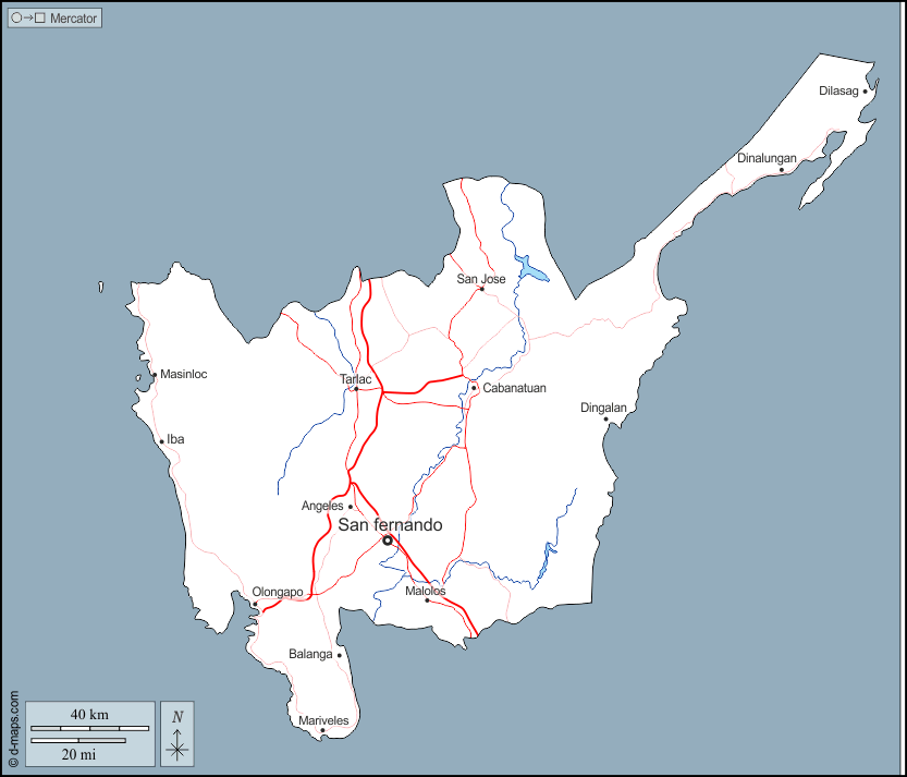d-maps > एशिया > फिलीपींस > मध्य लूज़ोन > बाह्यरेखा, जल-सर्वेक्षण, मुख्य शहरों, सड़कों, नाम