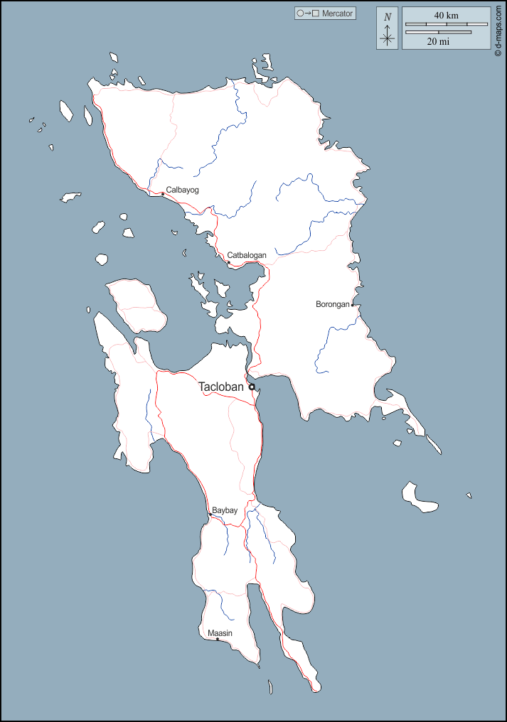 d-maps > एशिया > फिलीपींस > पूर्वी विसाया > बाह्यरेखा, जल-सर्वेक्षण, मुख्य शहरों, सड़कों, नाम