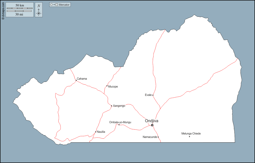 d-maps > अफ्रीका > अंगोला > कुनेने प्रांत > बाह्यरेखा, मुख्य शहरों, सड़कों, नाम