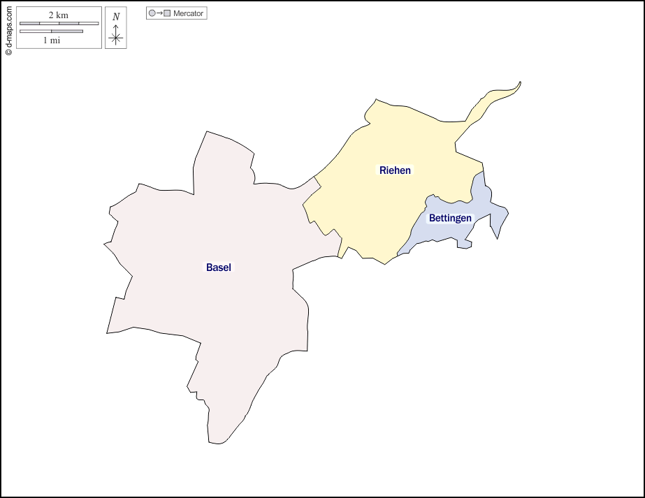 d-maps > यूरोप > स्विट्ज़रलैंड > बासल-श्तात कैन्टन > बाह्यरेखा, नगर पालिकाओं, नाम, रंग, सफेद