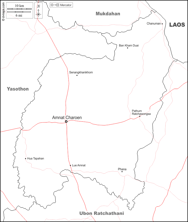 d-maps > एशिया > थाईलैंड > अम्नत चारोएन प्रान्त > सीमाओं, मुख्य शहरों, सड़कों, नाम, सफेद