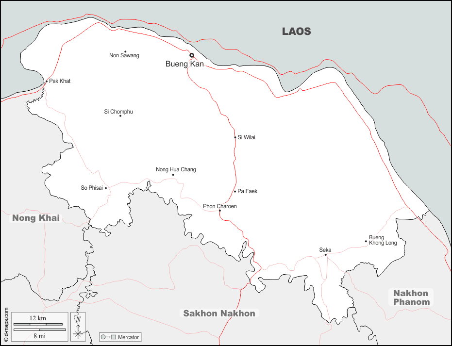 d-maps > एशिया > थाईलैंड > बुएंग कान प्रान्त > सीमाओं, मुख्य शहरों, सड़कों, नाम