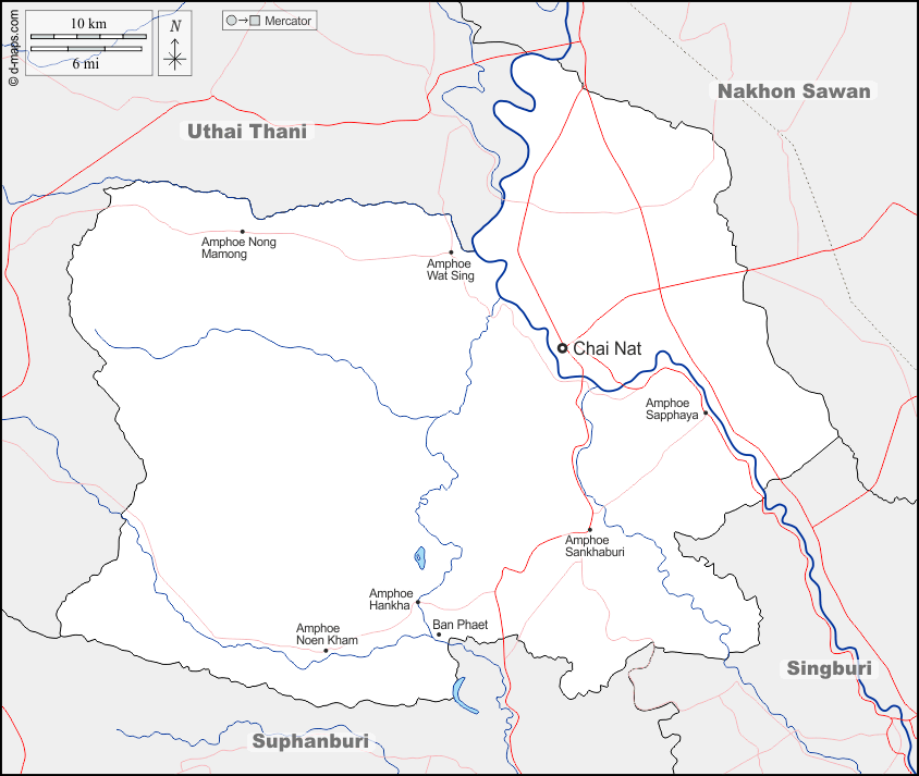 d-maps > एशिया > थाईलैंड > चइ नात प्रान्त > सीमाओं, जल-सर्वेक्षण, मुख्य शहरों, सड़कों, नाम