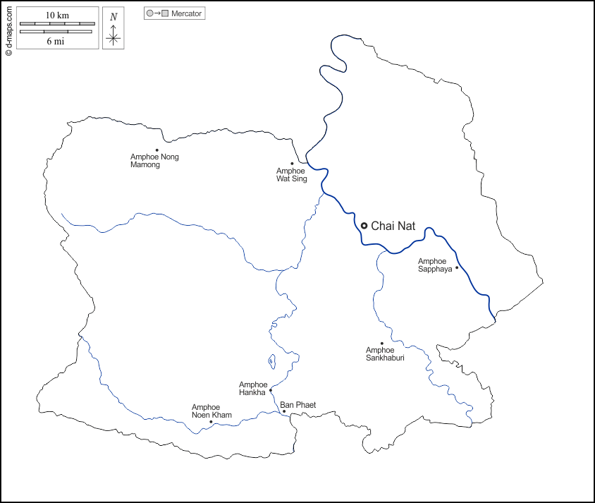 d-maps > एशिया > थाईलैंड > चइ नात प्रान्त > बाह्यरेखा, जल-सर्वेक्षण, मुख्य शहरों, नाम, सफेद