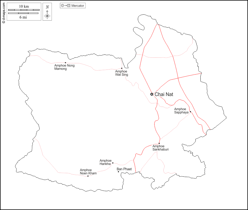 d-maps > एशिया > थाईलैंड > चइ नात प्रान्त > बाह्यरेखा, मुख्य शहरों, सड़कों, नाम, सफेद