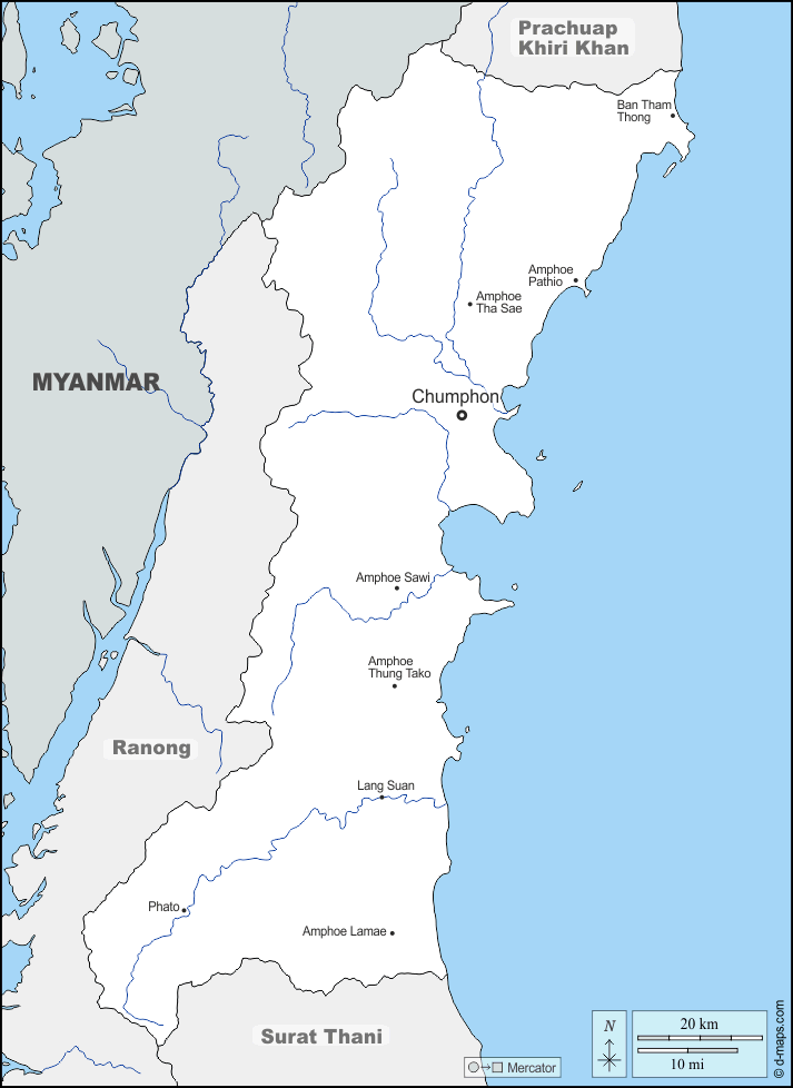 d-maps > एशिया > थाईलैंड > चुमफोन प्रान्त > सीमाओं, जल-सर्वेक्षण, मुख्य शहरों, नाम