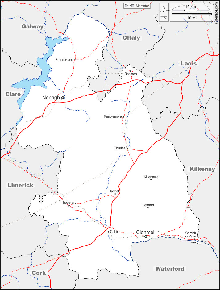 d-maps > यूरोप > आयरलैण्ड गणतंत्र > टिपरेरी > सीमाओं, जल-सर्वेक्षण, मुख्य शहरों, सड़कों, नाम