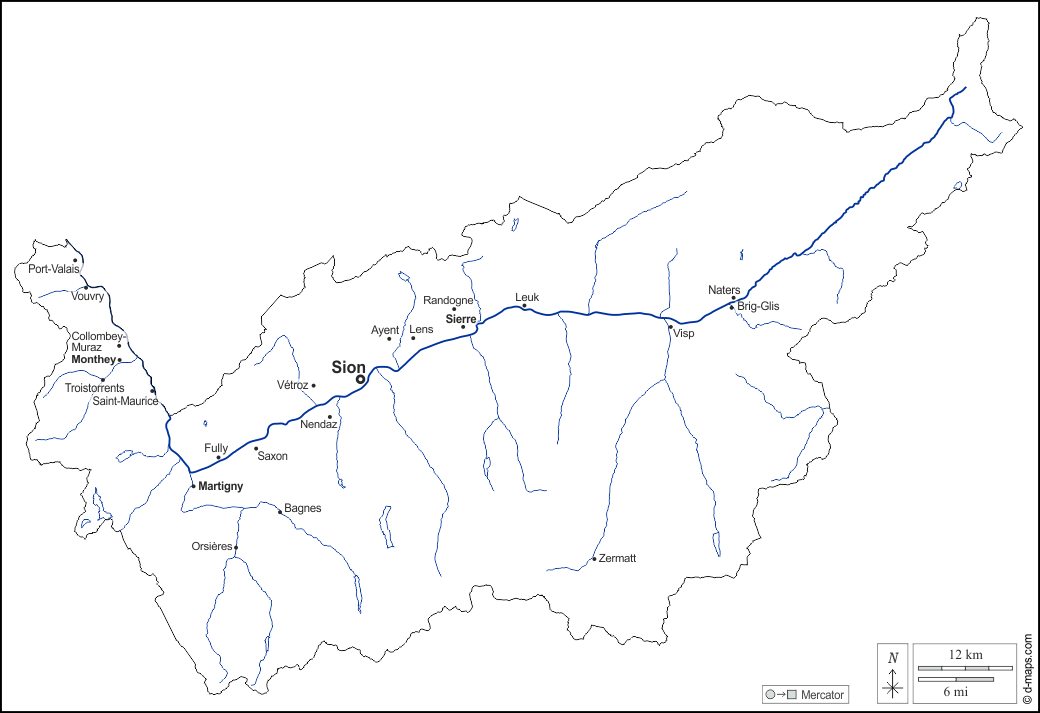 d-maps > यूरोप > स्विट्ज़रलैंड > वाले कैन्टन > बाह्यरेखा, जल-सर्वेक्षण, मुख्य शहरों, नाम, सफेद