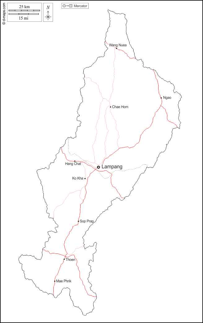 d-maps > एशिया > थाईलैंड > लम्पांग प्रान्त > बाह्यरेखा, मुख्य शहरों, सड़कों, नाम, सफेद