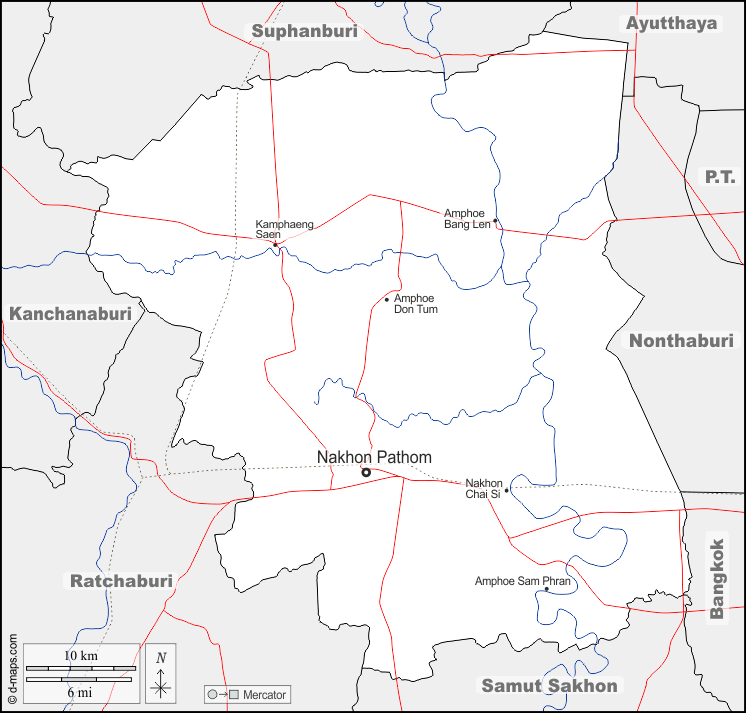 d-maps > एशिया > थाईलैंड > नखोन पथोम प्रान्त > सीमाओं, जल-सर्वेक्षण, मुख्य शहरों, सड़कों, नाम