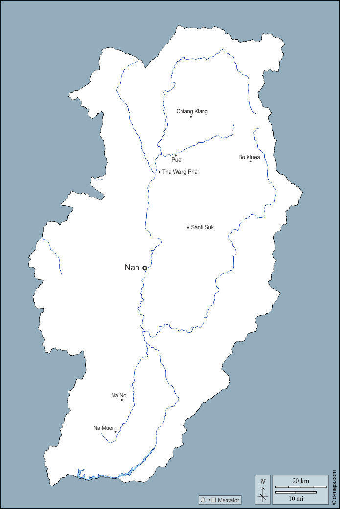 d-maps > एशिया > थाईलैंड > नान प्रान्त > बाह्यरेखा, जल-सर्वेक्षण, मुख्य शहरों, नाम