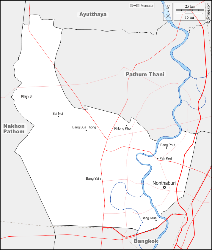 d-maps > एशिया > थाईलैंड > नोन्थाबुरी प्रान्त > सीमाओं, जल-सर्वेक्षण, मुख्य शहरों, सड़कों, नाम