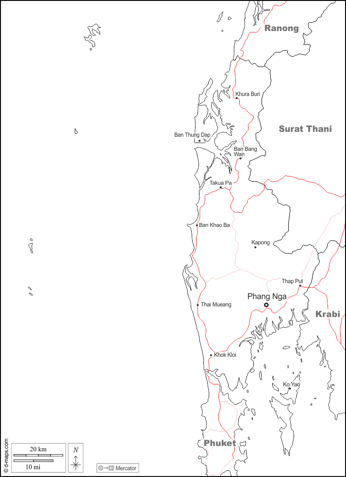 d-maps > एशिया > थाईलैंड > फंग अंगा प्रान्त > सीमाओं, मुख्य शहरों, सड़कों, नाम, सफेद