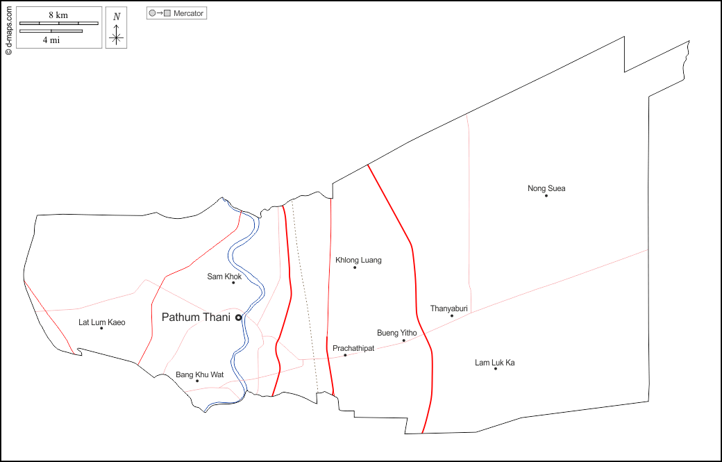 d-maps > एशिया > थाईलैंड > पथुम थानी प्रान्त > बाह्यरेखा, जल-सर्वेक्षण, मुख्य शहरों, सड़कों, नाम, सफेद