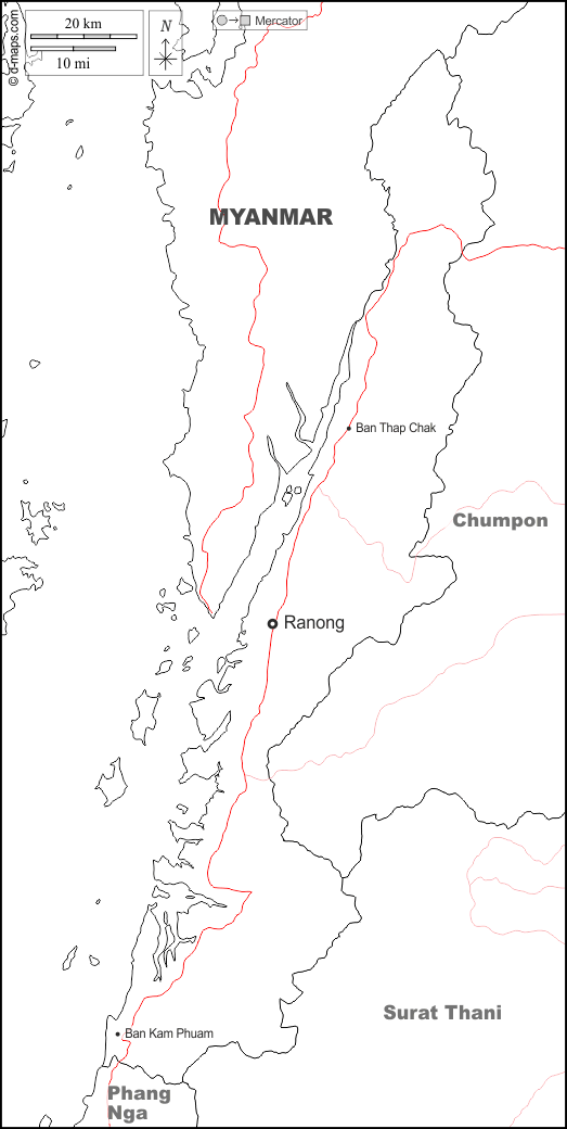 d-maps > एशिया > थाईलैंड > रनोंग प्रान्त > सीमाओं, मुख्य शहरों, सड़कों, नाम, सफेद