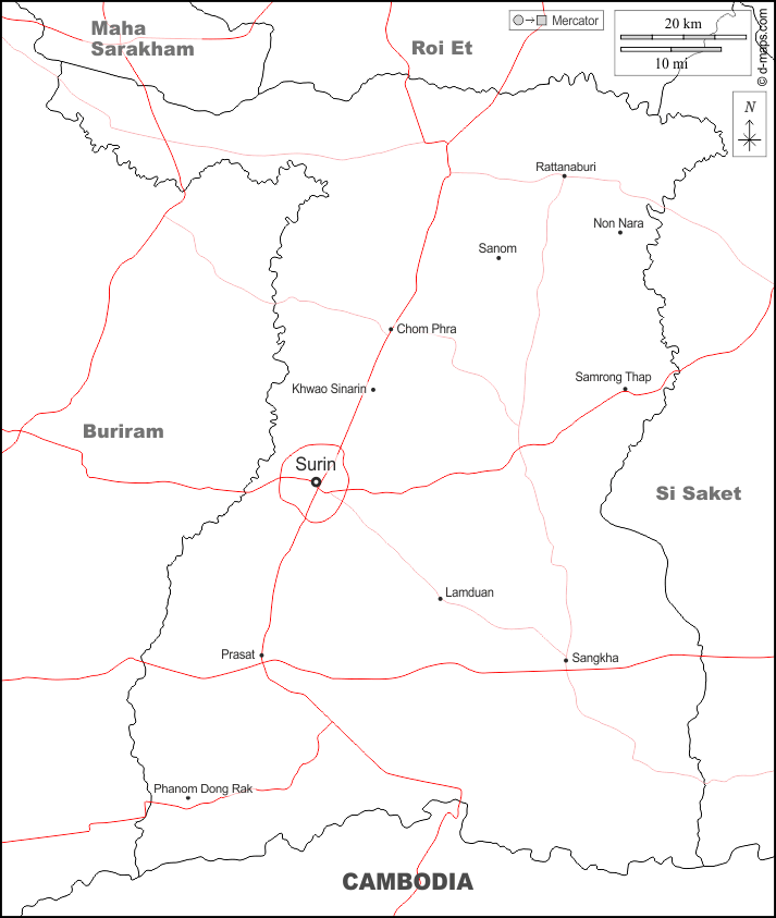d-maps > एशिया > थाईलैंड > सुरीन प्रान्त > सीमाओं, मुख्य शहरों, सड़कों, नाम, सफेद