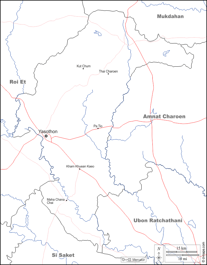 d-maps > एशिया > थाईलैंड > यसोथोन प्रान्त > सीमाओं, जल-सर्वेक्षण, मुख्य शहरों, सड़कों, नाम, सफेद