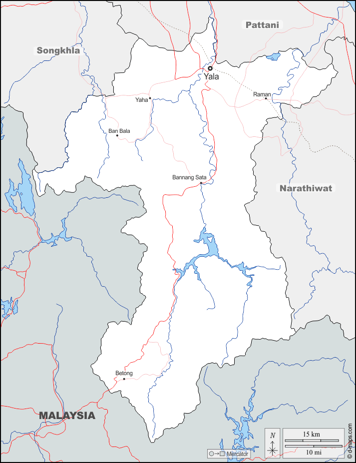 d-maps > एशिया > थाईलैंड > याला प्रान्त > सीमाओं, जल-सर्वेक्षण, मुख्य शहरों, सड़कों, नाम