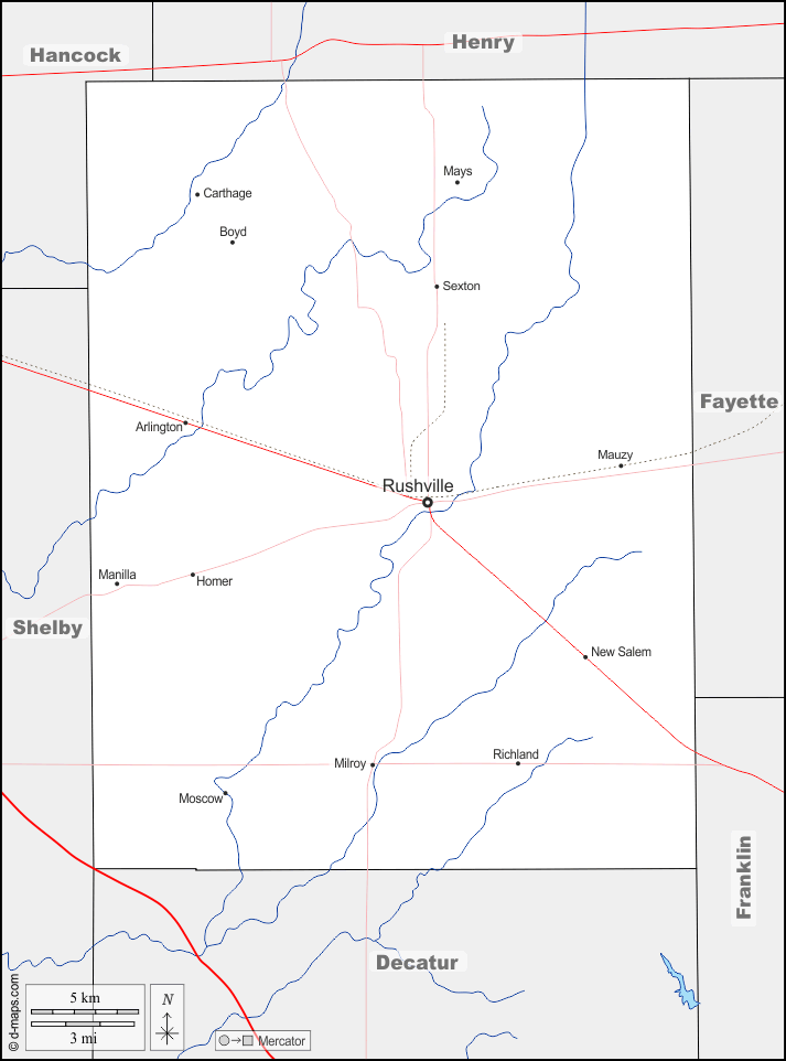 d-maps > संयुक्त राज्य > इंडियाना > रश काउंटी > सीमाओं, जल-सर्वेक्षण, मुख्य शहरों, सड़कों, नाम