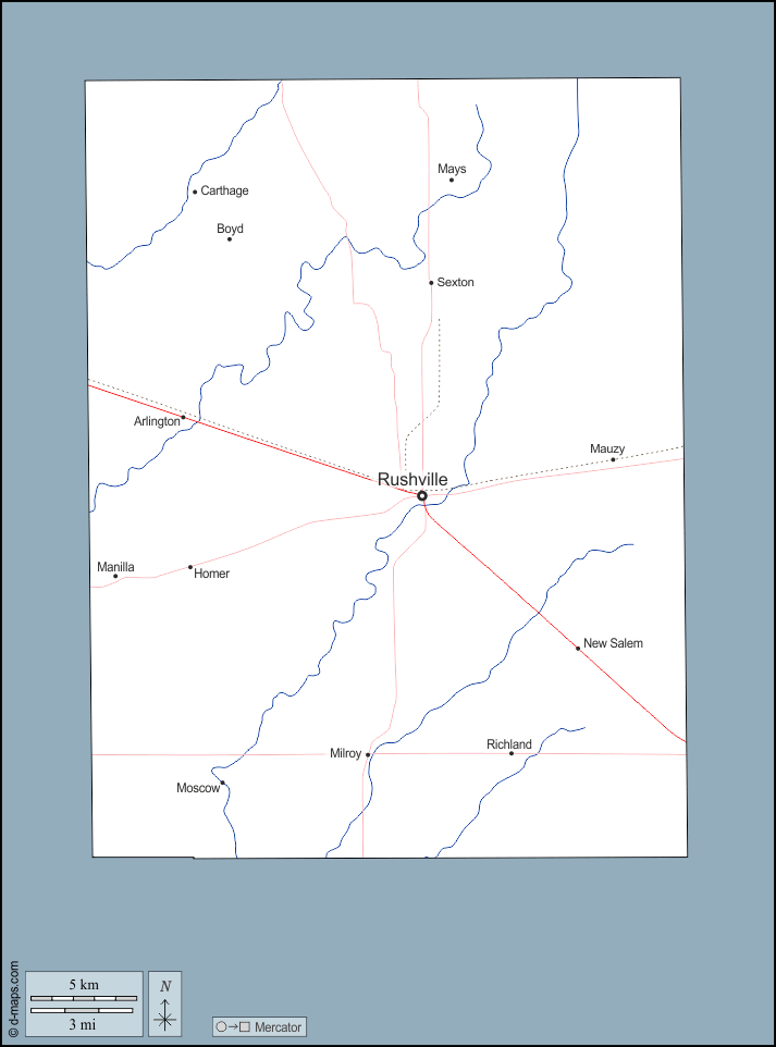 d-maps > संयुक्त राज्य > इंडियाना > रश काउंटी > बाह्यरेखा, जल-सर्वेक्षण, मुख्य शहरों, सड़कों, नाम