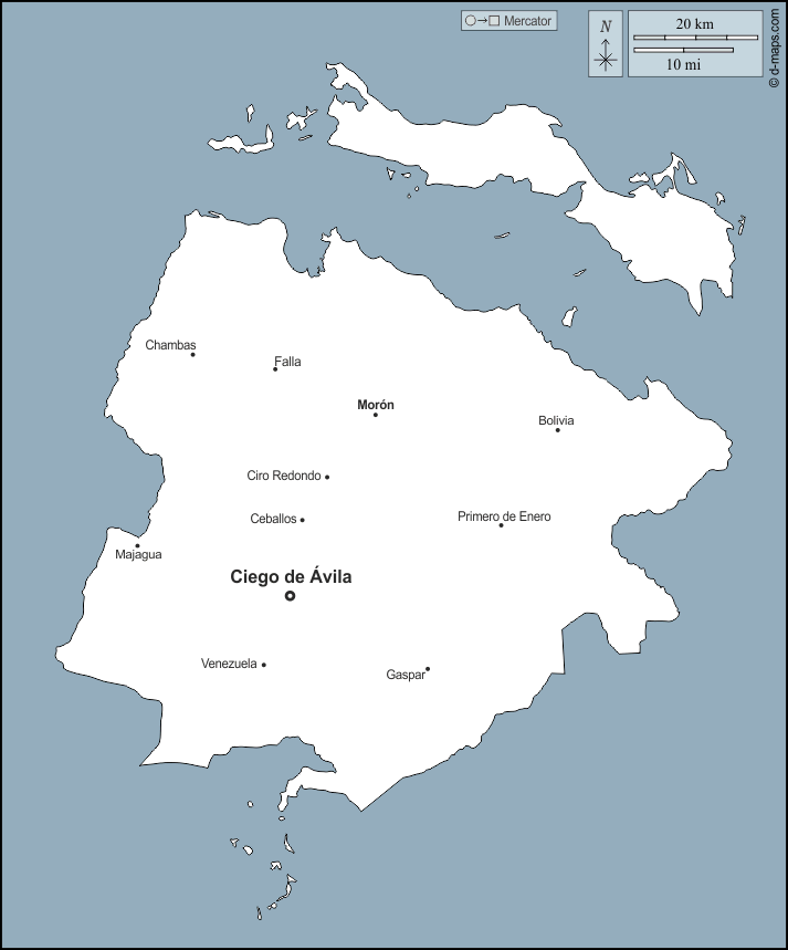 d-maps > महाअमेरिका > क्यूबा > सिएगो डे एविला प्रांत > बाह्यरेखा, मुख्य शहरों, नाम