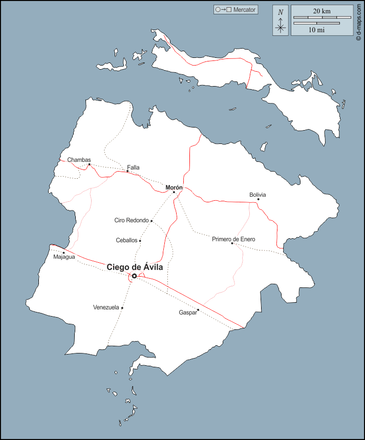 d-maps > महाअमेरिका > क्यूबा > सिएगो डे एविला प्रांत > बाह्यरेखा, मुख्य शहरों, सड़कों, नाम