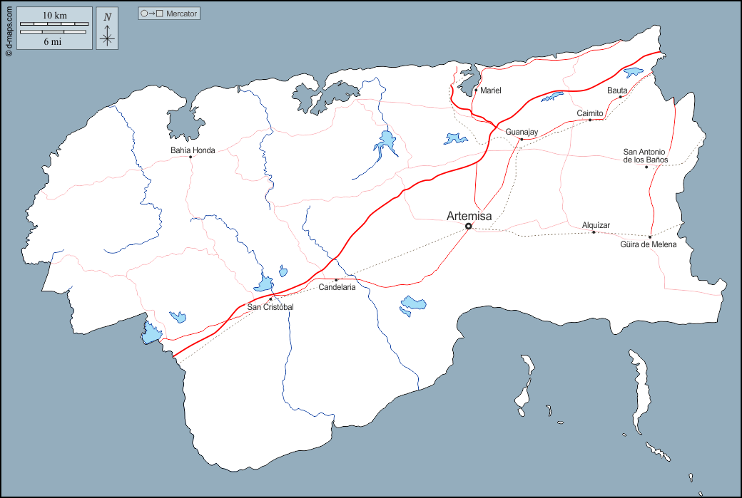 d-maps > महाअमेरिका > क्यूबा > आर्टेमिसा प्रांत > बाह्यरेखा, जल-सर्वेक्षण, मुख्य शहरों, सड़कों, नाम