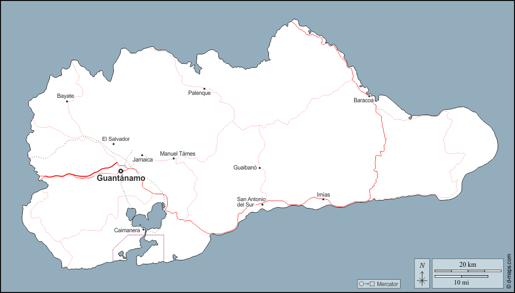 d-maps > महाअमेरिका > क्यूबा > ग्वांतानामो प्रांत > बाह्यरेखा, मुख्य शहरों, सड़कों, नाम